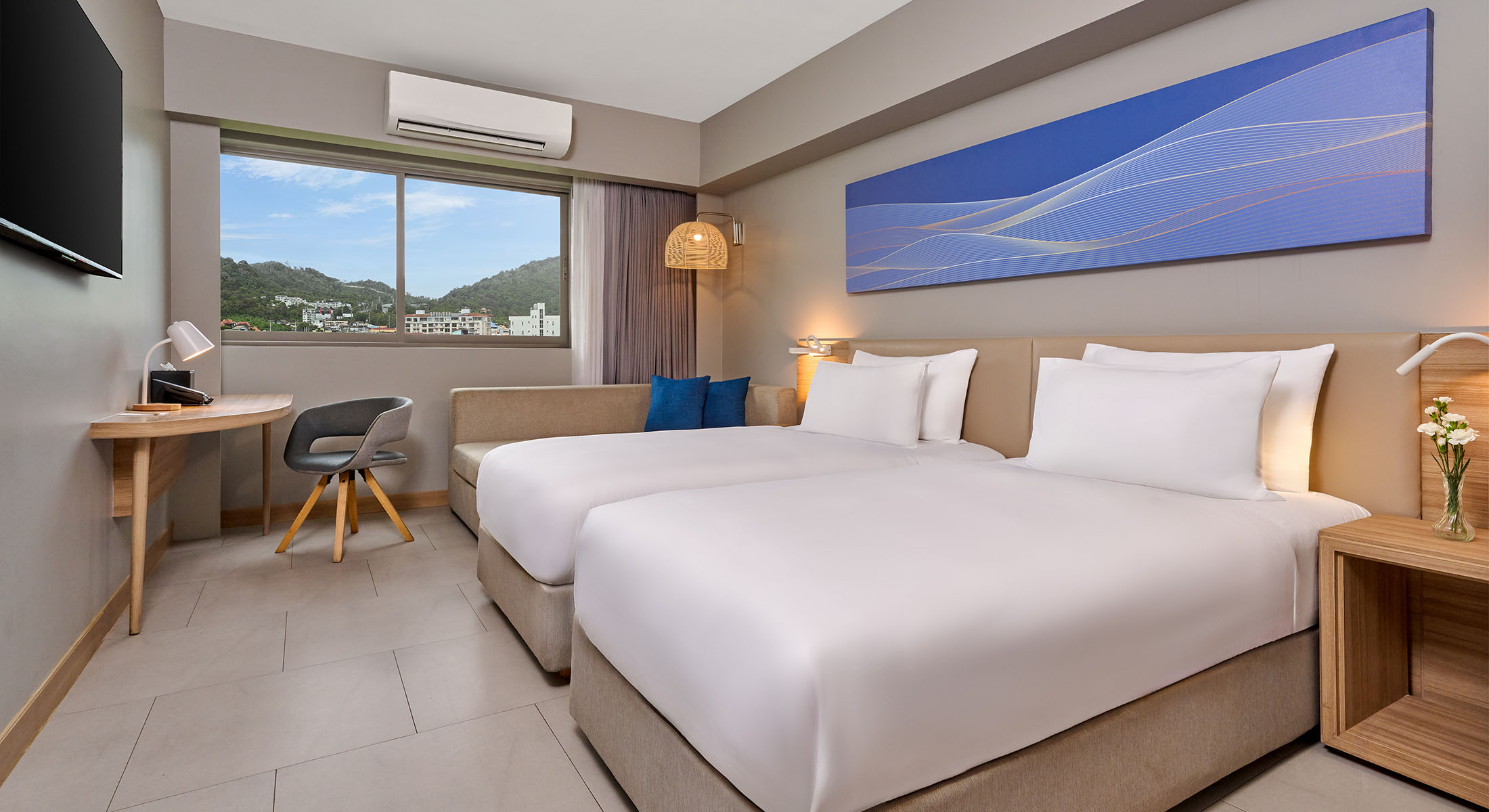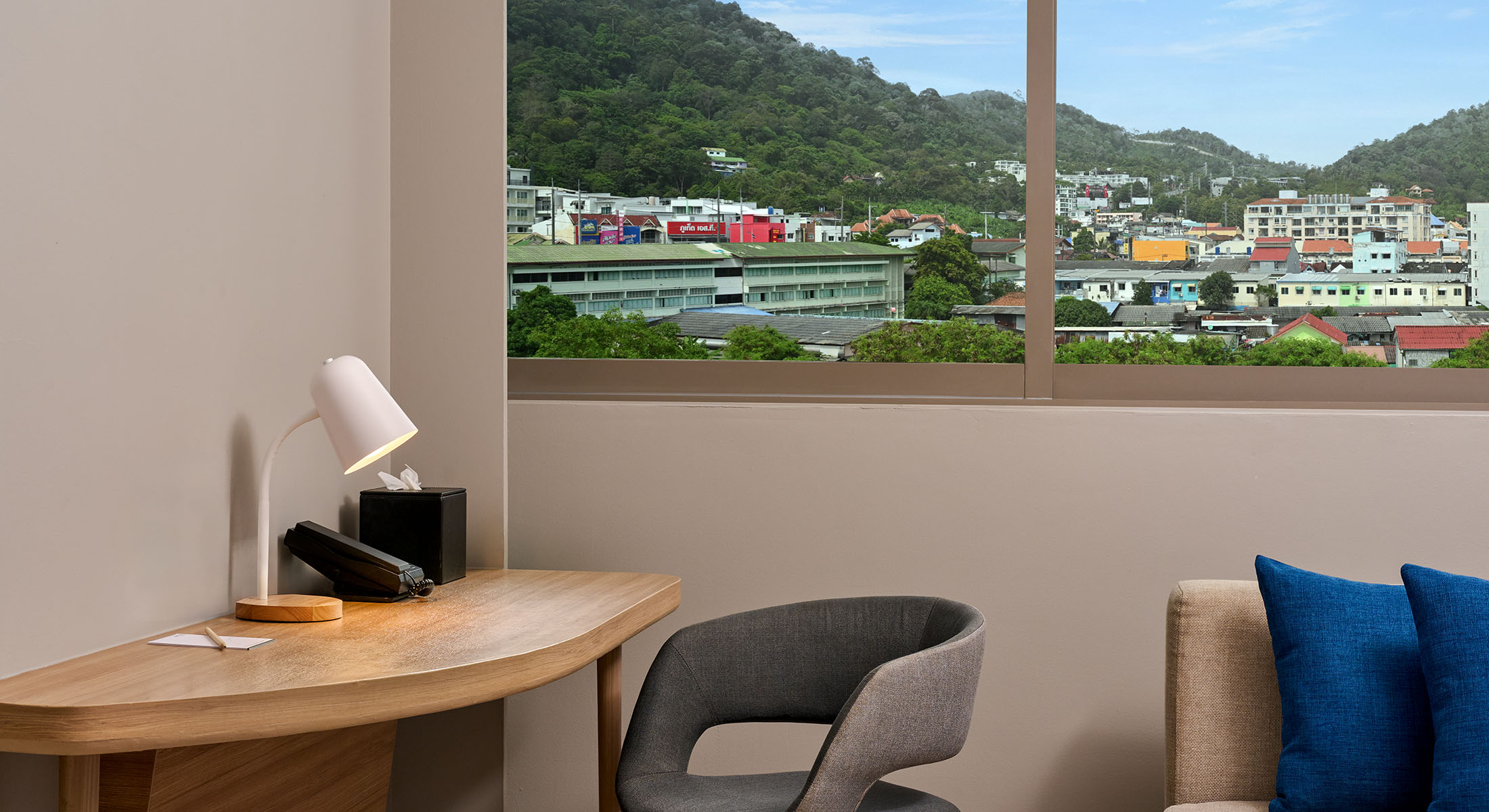 The room’s modern, tropical-inspired décor celebrates the rich cultural heritage of Phuket. Carefully curate local artistry, combined with its warm wood accents and light, airy tones, invites you to embrace a relaxed island state of mind. The spacious bathroom, finished in bright coastal hues, offers a walk-in shower and premium Mercure amenities, while the plush sofa is the perfect spot to recline and let your worries drift away. A versatile work desk allows you to balance productivity with the blissful pace of paradise. This is more than just a room; it’s your haven of comfort and connection.
